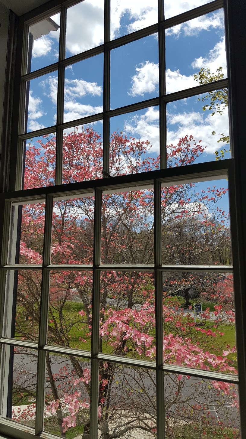 In practice, we can take moments throughout the day to look up and look out. These pictures are taken from inside the church I serve–looking out onto our community outside these church walls. We can see God at work in our world. We can pay attention–feeling grateful. And we can rejoice, for God is near.