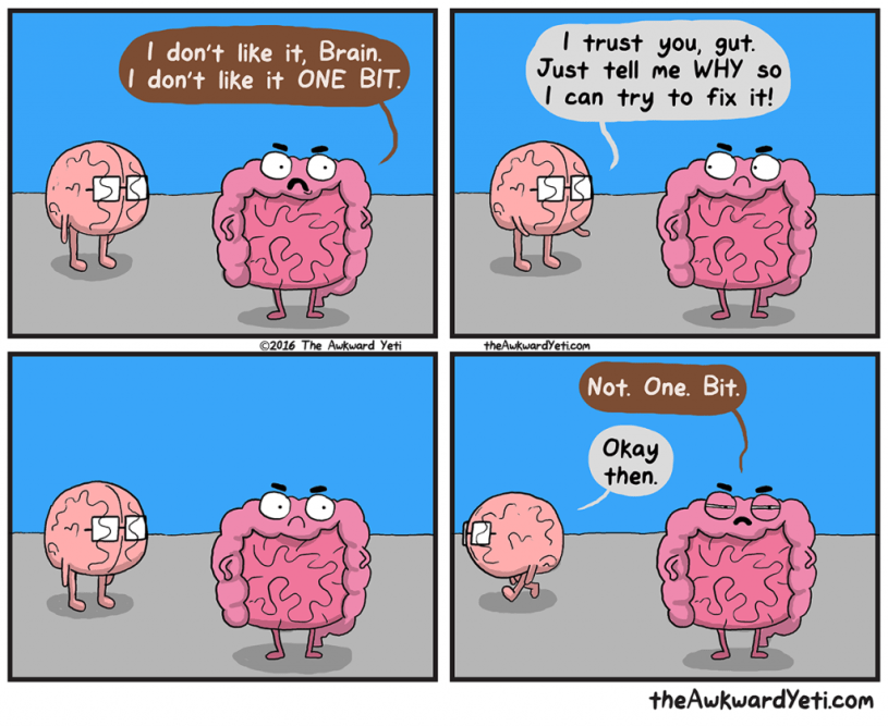 I love the above comic—it’s from The Awkward Yeti which depicts the adventures of heart and brain (and occasionally gut, tongue, liver, gallbladder, etc.) I love it because I’m someone who makes big decisions based on gut instinct. And I’ve learned over the years to trust my gut (even more than my heart or brain) in making important decisions.