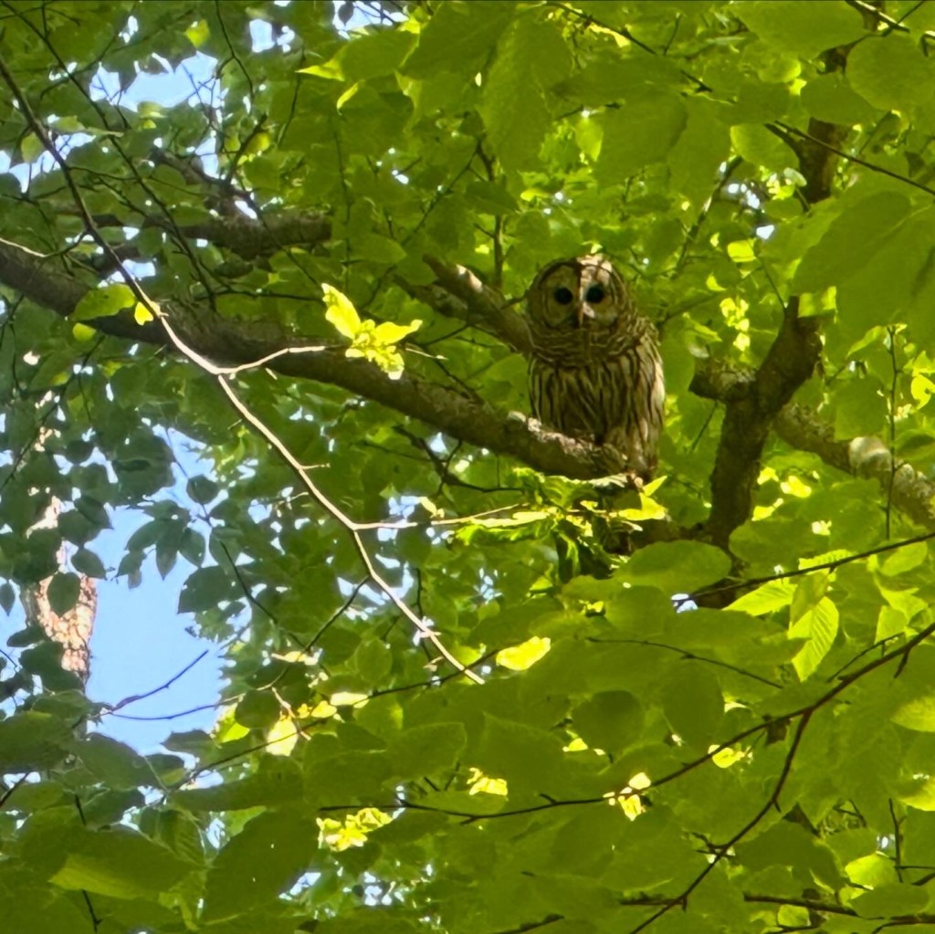 There were many birds calling out in the forest and I could swear that I heard an owl among them. I pulled out my phone (and my handy Merlin Bird ID app!) to see what birds were present. No owl was registering, but I kept hearing an owl call and just knew that an owl had to be close by. Sure enough, I lowered my phone and scanned the trees above me and our eyes locked.