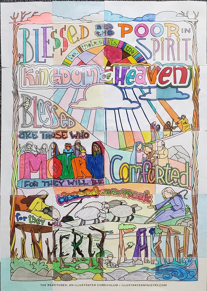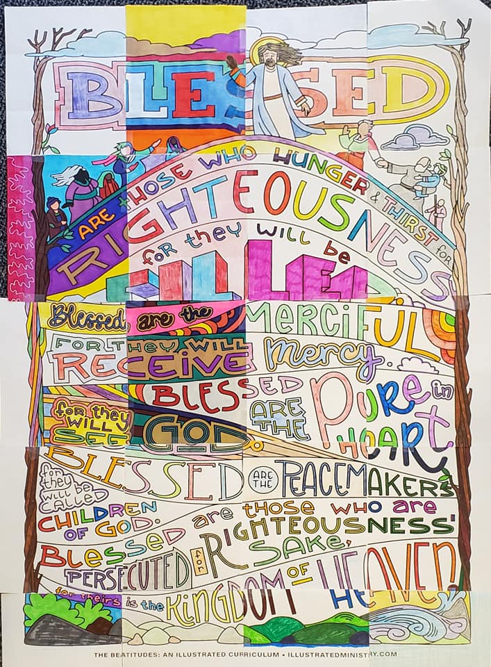 The Beatitudes are among the most important teachings Jesus shared with his followers as Jesus began teaching what became known as the Sermon on the Mount. This section of the Gospel according to Matthew marks Jesus’ first major speech beginning in chapter 5 and extending all the way through chapter 7 when Jesus finishes saying these words and the crowds are astounded at his teaching. The Sermon on the Mount is the most famous sermon Jesus ever preached. If you recall, our congregation here at CFC deeply engaged with the Beatitudes during the pandemic. Coloring pages from Illustrated Ministry were made available to members and friends of our congregation and we all individually colored images inspired by these teachings. Then we mailed or dropped off those finished masterpieces back to church and Nicole assembled the individual coloring sheets to become larger posters that visually represented these blesseds.